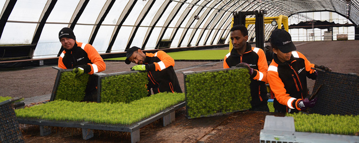 Kl 07.00 varje morgon börjar arbetsdagen för Andemeskel Weldemariam, Ali Teum, Msagna Beyru och Yordanas Tekle. De cyklar in från sina bostäder i Hallsberg till plantskolan i Vibytorp, några kilometer utanför samhället.