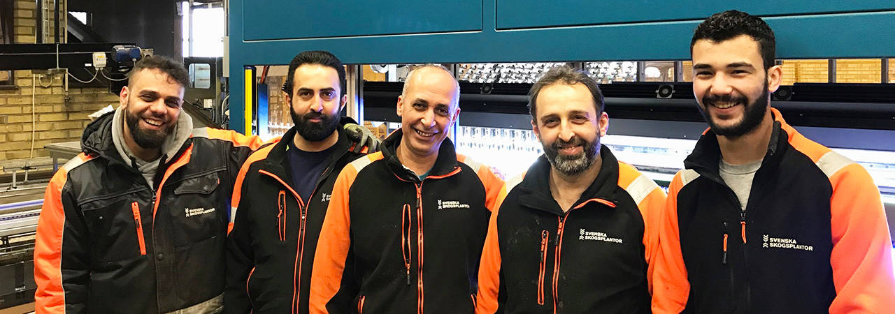 Ubeid, Mohammed, Mohammad, Ahmed och Samer har precis gått av sitt skift när vi träffas. Alla jobbar i produktionslinjen på Svenska Skogsplantors plantskola i Trekanten, ett par mil väster om Kalmar. Stämningen är uppsluppen och glad, alla känner varandra väl och stortrivs både med jobbet i sig och med arbetskamraterna.